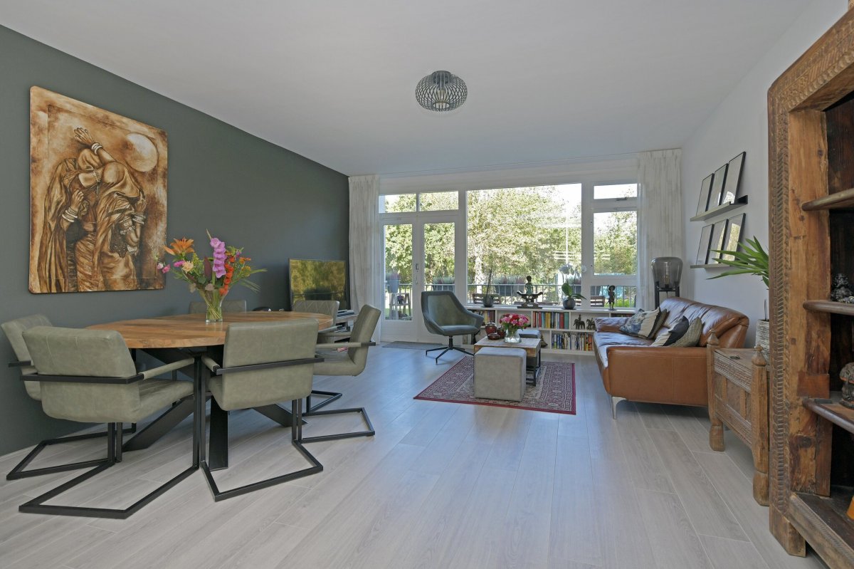 - Spacious and bright living room with beautiful laminate floor(2019) with underfloor heating, plastered walls and ceiling, 3 fixed cabinets, 1 with central heating boiler (Remeha Avanta, about 2015) large windows and open doors to the sunny balcony with beautiful views over Natuurpark Wapendal and the Bosjes van Pex.