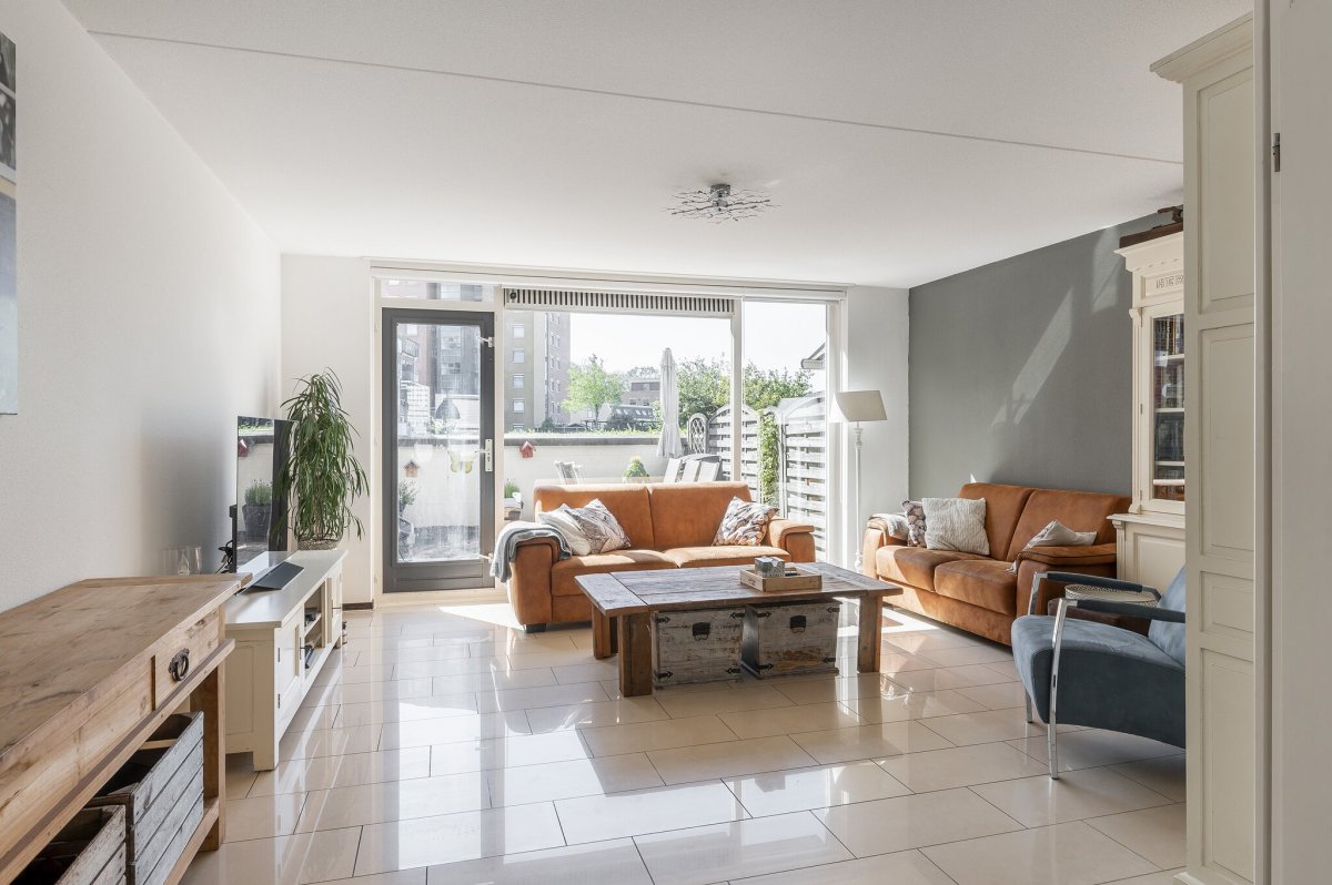 - Via de overloop komt u binnen in de woonkamer met een fijne lichtinval en plavuizenvloer met vloerverwarming. Vanuit de woonkamer is er toegang tot het zonnige dakterras.