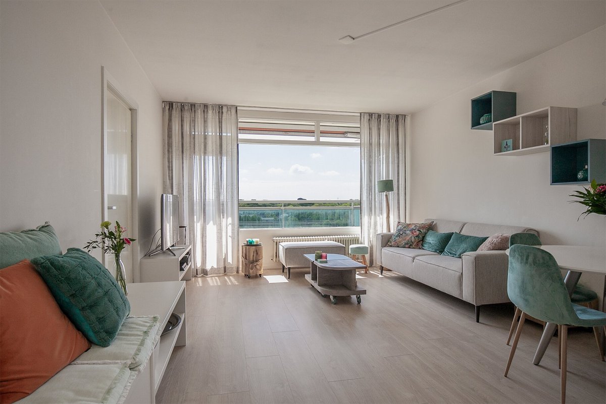 - Ruime en lichte woonkamer met gladde wanden, mooie laminaat vloer, fraai uitzicht en toegang tot het zonnige balkon;