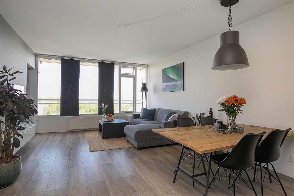 - Ruime en heerlijk lichte woonkamer voorzien van laminaatvloer. Vanuit de woonkamer is er toegang tot het zonnige balkon over de gehele breedte van de woning. Vanuit de woonkamer en het balkon heb je een fantastisch en groen uitzicht;