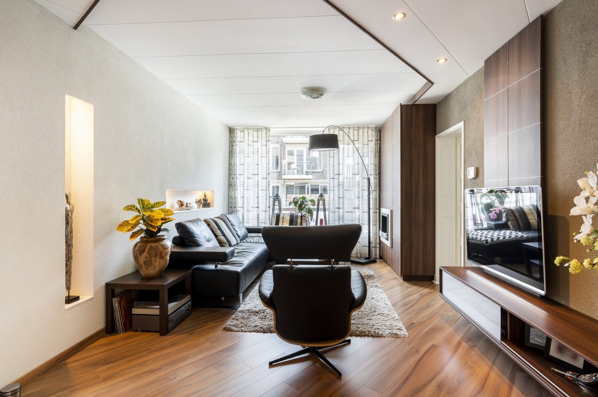 - Lichte en ruime woonkamer met verlaagd plafond met spotjes en een mooie laminaatvloer met aan de voorzijde het zitgedeelte met mooie wandmeubel met ethanol haard. Aan de achterzijde bevindt zich de open keuken met voldoende plek voor de eettafel.