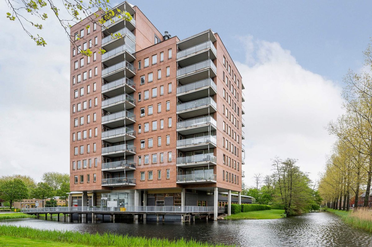 - Via een loopbrug over het water bereikt u de afgesloten lichte entree van het gebouw met brievenbussen, videofoon en toegang tot twee liften.