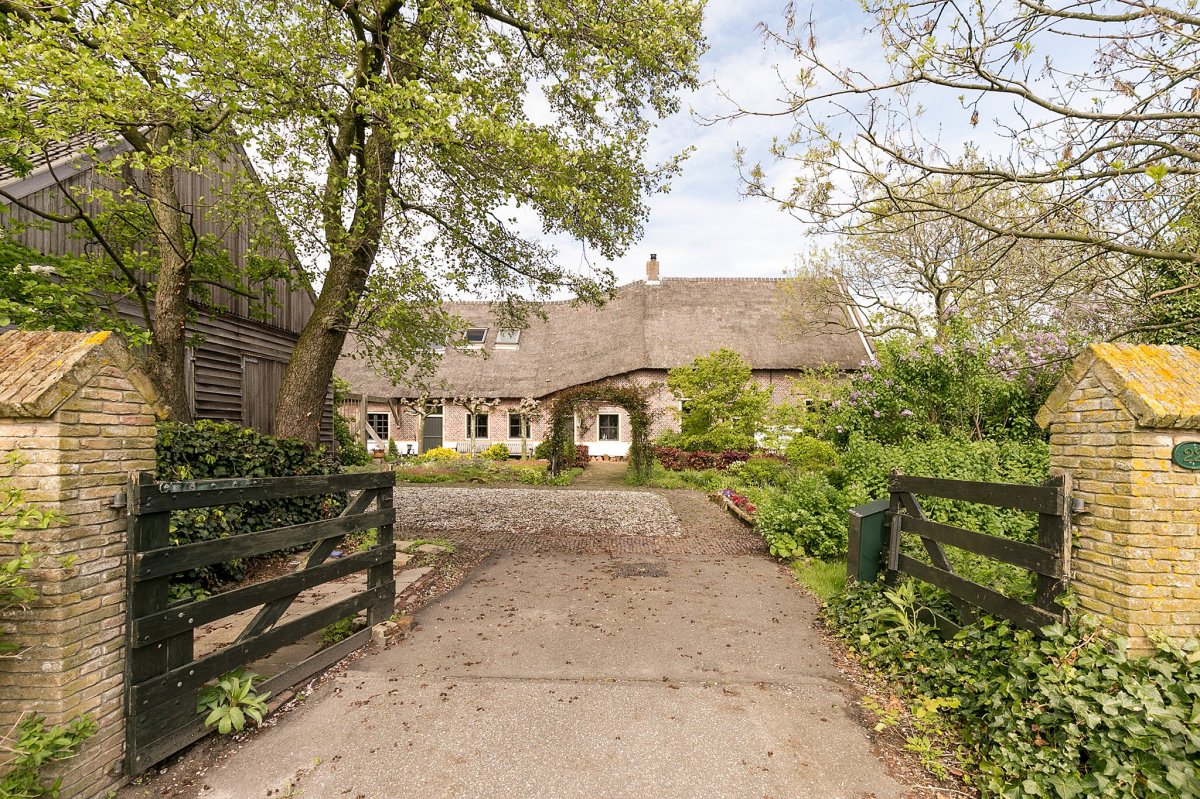 - Oprijlaan met sloot en bomen aan het einde waarvan de woonboerderij met rieten dak opvalt.