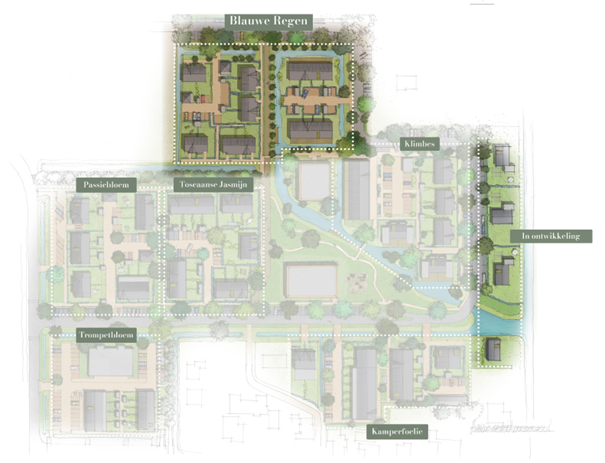 De Blauwe Regen staat bekend om haar sierlijke trossen die in het voorjaar prachtig in bloei staan. Net als deze klimplant straalt het buurtje Blauwe Regen elegantie en karakter uit. De twee-onder-een-kapwoningen en rijwoningen vormen samen een harmonieus geheel. Stijlvol, vriendelijk en met oog voor detail. Of je nu valt voor de ruimte en luxe van een twee-onder-een-kapwoning of de gezelligheid van een rijwoning: in Blauwe Regen woon je heerlijk. Grote raampartijen zorgen voor een lichte leefruimte en de groene omgeving nodigt uit tot ontspannen. Hier bloeit het woonplezier vanzelf op!